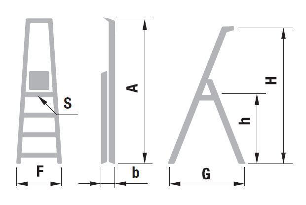Jednostranné schůdky s poličkou Eurostyl, počet nášlapů vč. plošinky 1x3 až 1x6, rozměry plošinky 264 x 262 mm, max. výška plošinky 0,55 až 1,19 m a šířka schůdků 407 až 480 mm.