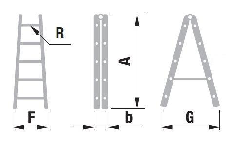 Štafle dřevěné, počet příček 2x3 až 2x10, rozteč příček 290 mm, max. pracovní výška 2,4 až 4,5 m a šířka 450 až 750 mm. Hmotnost je u tohoto výrobku uváděna vzhledem k materiálu s tolerací +/- 10%.
