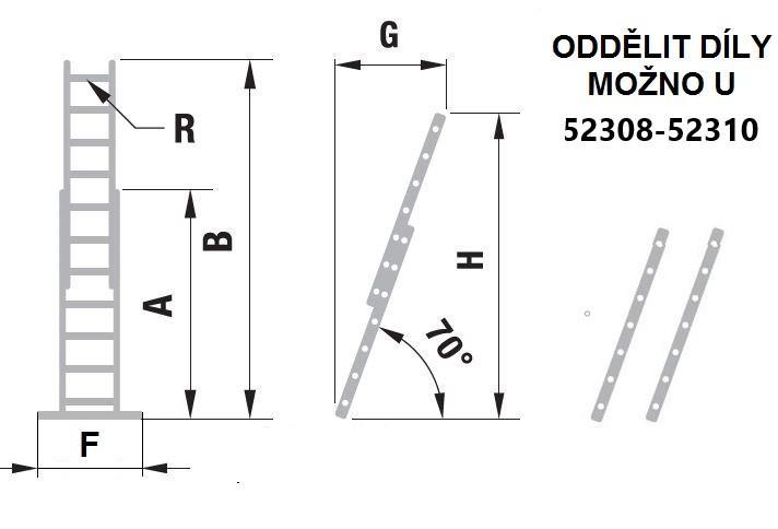Dvoudílný výsuvný žebřík Premium, počet příček 2x8 až 2x16, max. výsuvná délka 3,83 až 8,08 m a šířka 420 mm.